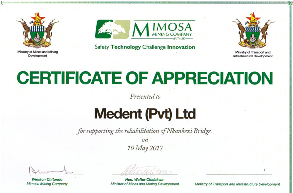 Medent Safety assisted in the refurbishment of the Nkankezi Bridge which was destroyed by Cyclone Dineo in Insiza district, Matabeleland South. The bridge was one of the major road infrastructure destroyed by the cyclone induced rains and the organization contributed towards its reconstruction as part of its CSR efforts. Then transport minister, Dr Joram Gumbo, thanked partners for providing part of the contributions for the bridge reconstruction.